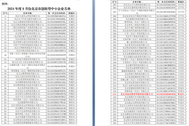 根據(jù)《北京市經(jīng)濟和信息化局關于對2024年度9月份北京市創(chuàng)新型中小企業(yè)名單進行公告的通知》(2024年11月27日),按照工業(yè)和信息化部《優(yōu)質中小企業(yè)梯度培育管理暫行辦法》(工信部企業(yè)〔2022〕63號)、《北京市優(yōu)質中小企業(yè)梯度培育管理實施細則》要求,2024年度9月份北京市創(chuàng)新型中小企業(yè)名單已經(jīng)確定,現(xiàn)予以公告。